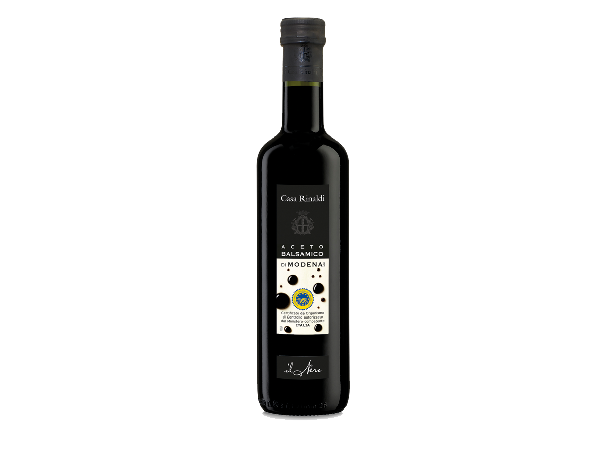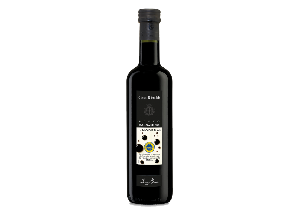 Black and shiny in color, Casa Rinaldi's PGI balsamic vinegar of Modena "Il nero" has a slightly pungent odor, while the flavor is sweet and sour. Its density is 1,072.