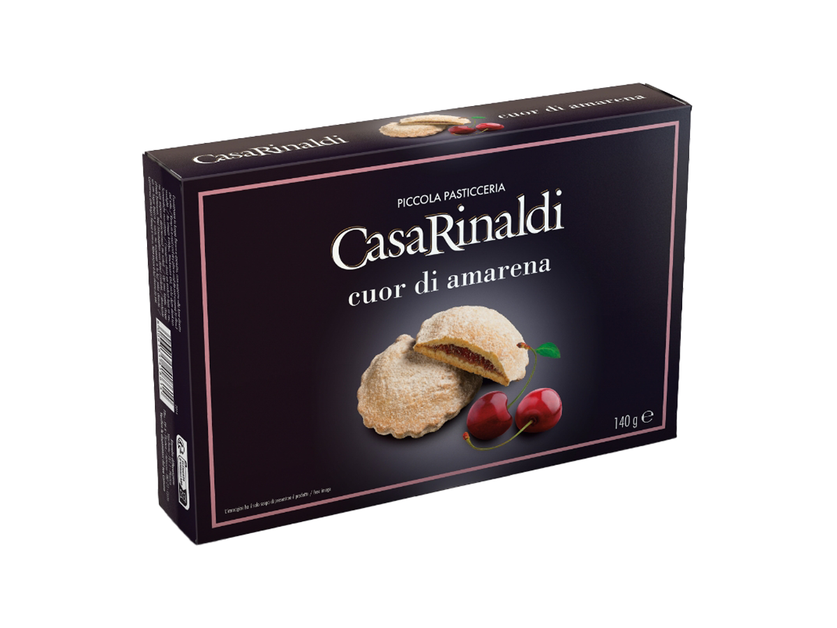 Delicious, crispy crescent-shaped biscuit with amarena cherry jam filling, completed with a dusting of powdered sugar. Marvellous contrast between the fragrant biscuit and the soft, creamy centre.