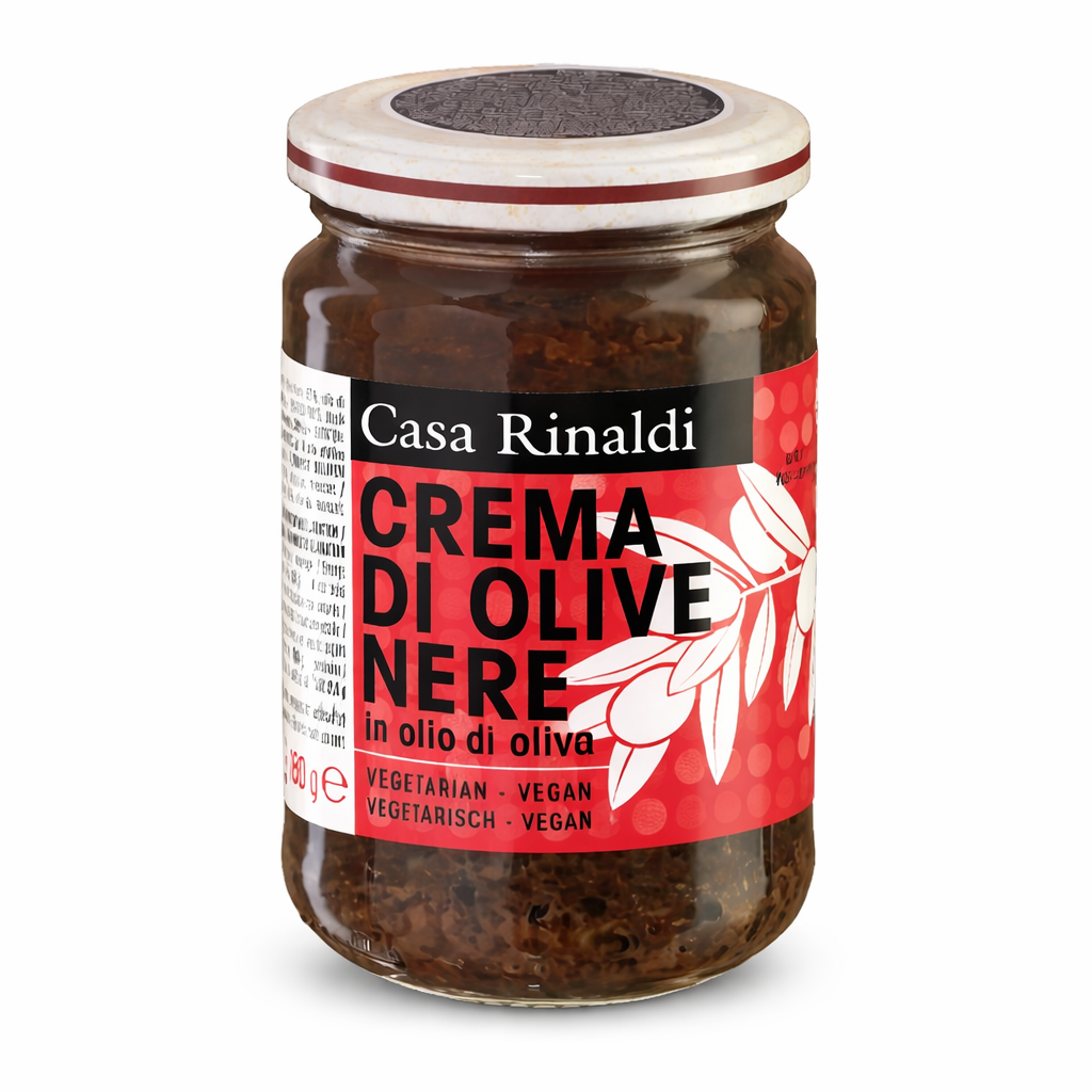 Casa Rinaldi offers a Mediterranean flavor sauce made of only two simple ingredients: black olives and olive oil. The intense flavor of olives makes this cream perfect to be added to pasta sauces, fish dishes and white meats. It is also excellent on finger foods and pizza.