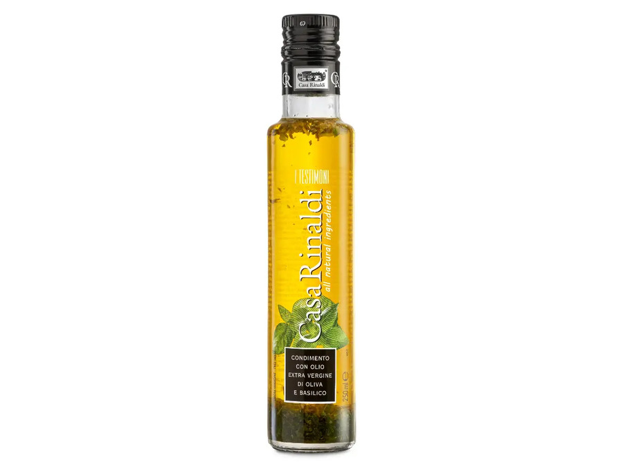 Our extra virgin olive oil with basil has a yellow color, enriched by the leaves of basil. The aroma is as intense as basil itself.