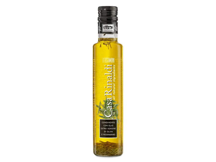 Casa Rinaldi's extra virgin olive oil with rosemary is yellow in color and accompanied by rosemary leaves. It has the intense smell of rosemary and the fruity fragrance of extra virgin olive oil.