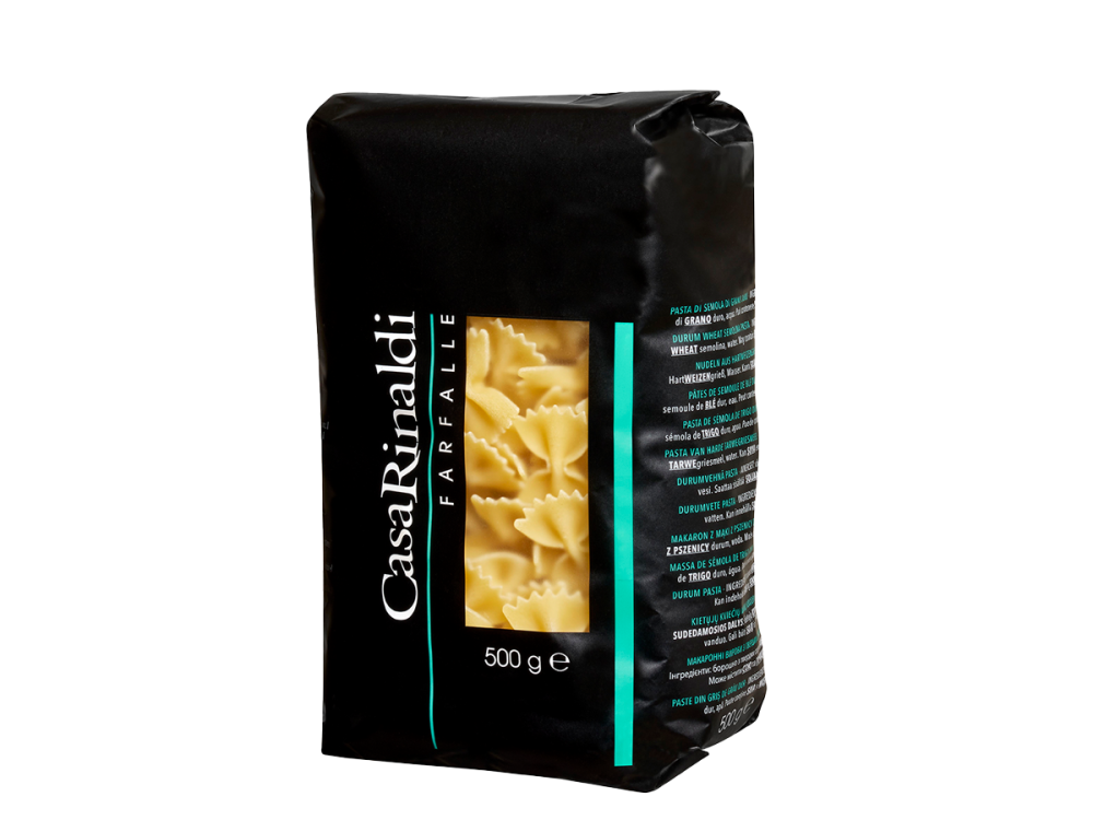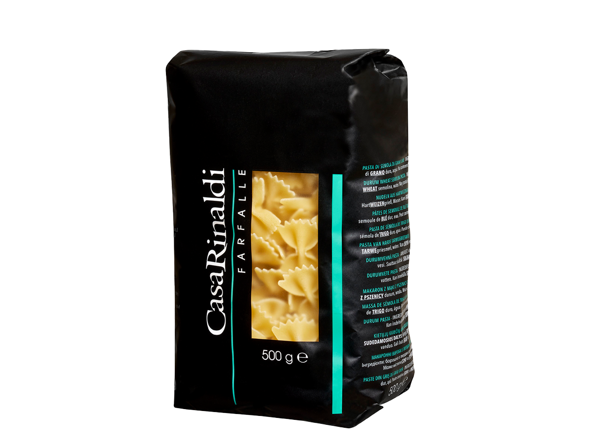 Farfalle n. 505 by Casa Rinaldi recall handmade pasta thanks to their rough surface and their full-bodied consistency. The scent is delicate, as is the taste. Given the particular and distinctive shape, they are perfect for those who love pasta al dente.