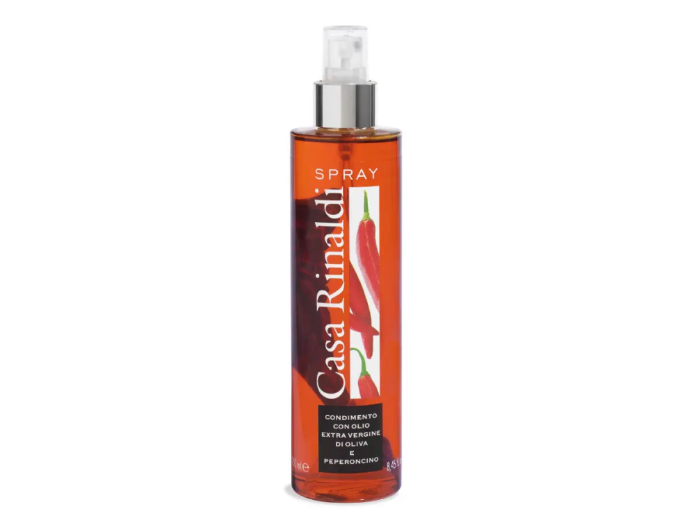 Casa Rinaldi's chili pepper flavored extra virgin olive oil spray is a shiny red oil. It is enriched by chili pepper bits and seeds, a spicy fragrance and taste now in a handy spray size.