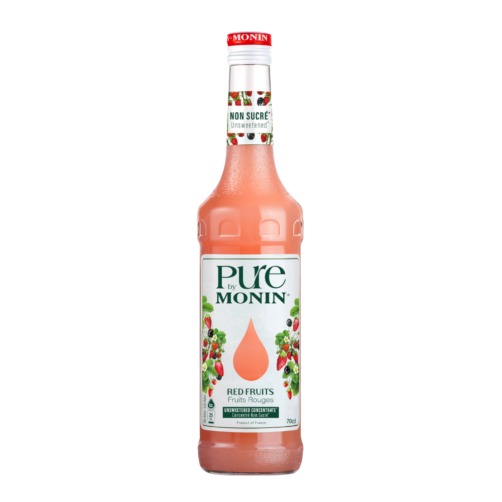 Monin Pure Concentrate Red Fruit is a beverage concentrate for making cocktails, lemonades and bubble teas and contains no added sugar. Instead, the French manufacturer Monin relies on the sweetness of fruit juice. The Monin Pure Red Fruit Concentrate contains strawberry juice, wild strawberry juice and blackcurrant juice.