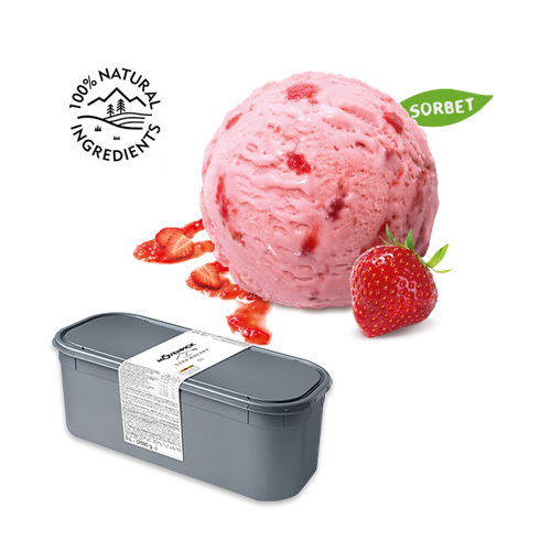 The strawberries we select for this sorbet are extremely juicy, sweet and fragrant, thus contrasting beautifully with the slightly acidic notes of the raspberries. Thanks to a particularly careful pureeing process the strawberry pieces retain their full aroma.