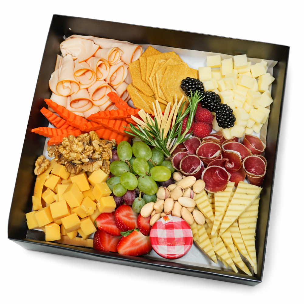 The SOLO Plater includes 4 types of cheeses, rustic crackers, two types of cold cuts meats, seasonal fruit and veggies, and a portion of jam