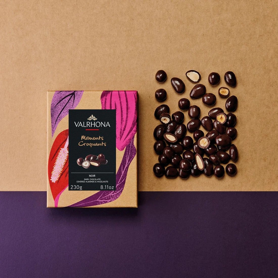 Fall for this assortment of almonds and hazelnuts coated in Valrhona dark chocolate. Ideal as a gift or snack.
