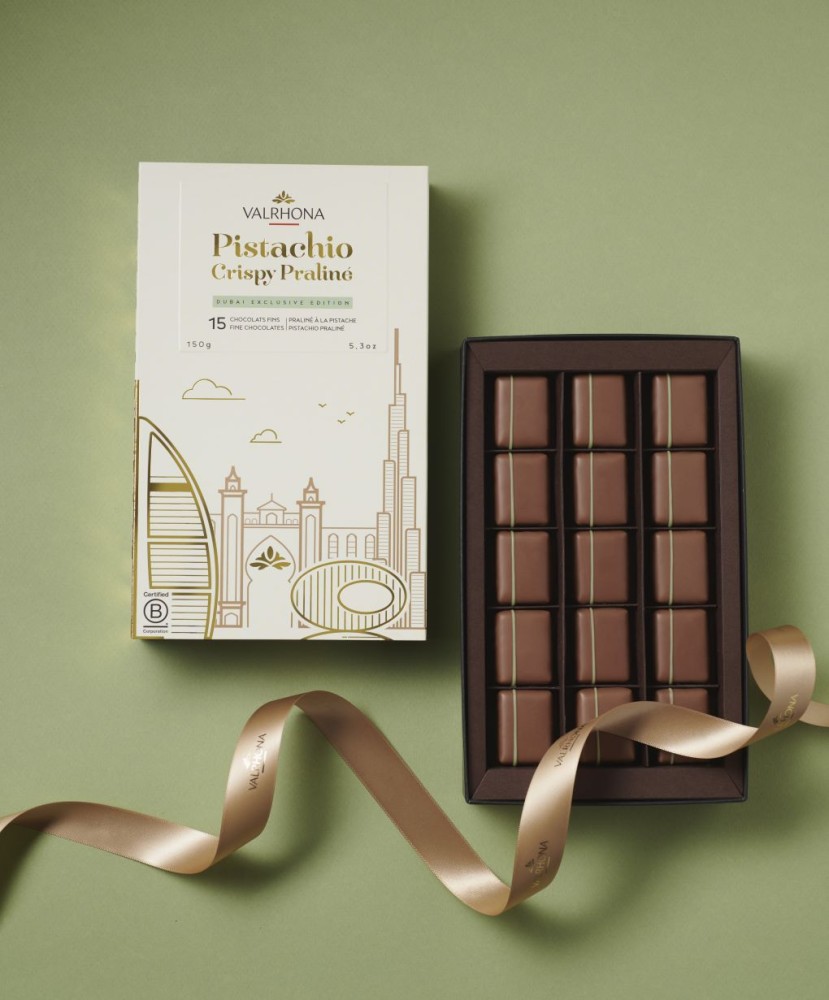Made with the same recipe as the global launch, the Dubai edition of the Pistachio Crispy Praliné Gift Box combines pistachio praline, a crisp texture and smooth milk chocolate.